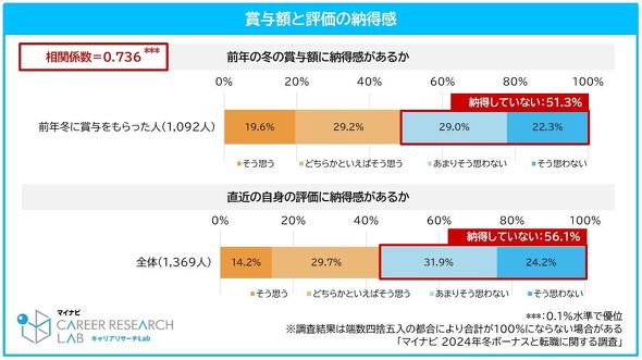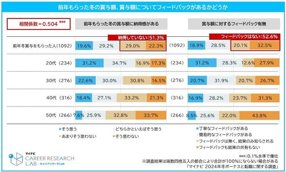 マイナビのキャリアリサーチラボ研究員の朝比奈あかり氏は「賞与額への納得感を高めるには、評価に関するフィードバックの制度化が重要。特に20代は賞与額の低さが転職理由となりやすく、企業側の対応が求められる」と考察した。