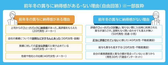 賞与額への納得感がない理由として「評価へのフィードバックがない」「正当に評価されていない」などの声が挙がった。納得感がある人からは「上司からのフィードバックに納得感があった」「会社の業績についての説明がきちんとあった」などの意見が寄せられた。