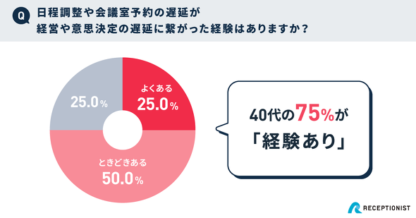 また、日程調整、会議室予約の遅延が経営や意思決定の遅延につながった経験の有無について、40代の75%が「よくある」「ときどきある」と回答した。
