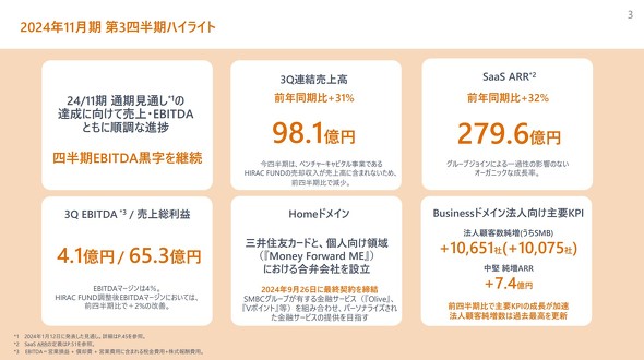 マネーフォワードの成長が止まらない。2024年11月期第3四半期(6〜8月)の定期収益を年換算したARR(年間経常収益)は前年同期比32%増の279.6億円に達した。10月に始まったインボイス制度への対応需要も追い風となり、法人向けバックオフィスSaaS事業の新規契約は過去最高を更新。第3四半期の法人顧客純増数は1万651社と過去最大になった。