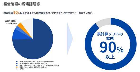 企業における経営管理の実態は、いまだに手作業とExcelが主流だ。マネーフォワードの調査によると、顧客企業の90%以上がExcelでの管理に課題を抱えており、必要な数値にすぐにたどり着けていない状況が明らかになっている。予算策定から経営分析、予実管理まで、多くの企業がExcelで対応している。M&Aの増加やグループ経営の進展によって、より高度な経営管理へのニーズが高まっているが、システム化が追いついていないのが現状だ。