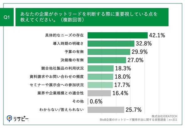 B2B企業のマーケ担当はどのようにホットリードを判断しているのか? 「あなたの企業がホットリードを判断する際に重要視している点を教えてください」(複数回答)という質問に対し、42.1%が「具体的なニーズの存在」と回答した。以降「導入時期の明確さ」(32.8%)、「予算の有無」(29.9%)と続いた。