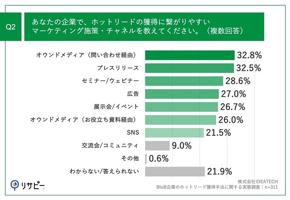 ホットリード獲得につながりやすいマーケティング施策・チャネルを尋ねたところ、1位は「オウンドメディア(問い合わせ経由)」で、32.8%が効果を実感していることが分かった。2位は「プレスリリース」(32.5%)、3位は「セミナー/ウェビナー」(28.6%)となった。