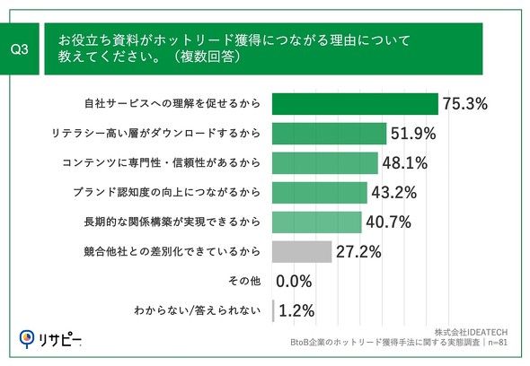 上記で「オウンドメディア(問い合わせ経由)」と回答した人はその理由について、75.3%が「自社サービスへの理解を促せるから」、51.9%が「リテラシー高い層がダウンロードするから」、48.1%が「コンテンツに専門性・信頼性があるから」を挙げた。
