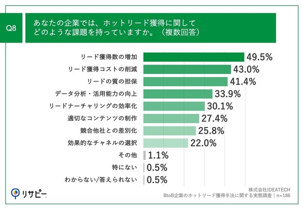挙げられた課題(複数回答)として最も多かったのは「リード獲得数の増加」(49.5%)だった。以降「リード獲得コストの削減」(43.0%)、「リードの質の担保」(41.4%)、「データ分析・活用能力の向上」(33.9%)、「リードナーチャリングの効率化」(30.1%)と続いた。
