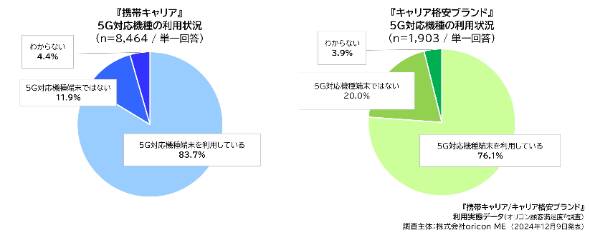 5Gスマホの利用状況について「利用している」と回答した人は、携帯キャリア利用者が83.7%、キャリア格安ブランド利用者が76.1%だった。