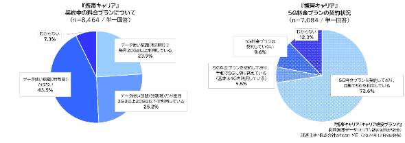 携帯キャリアの5Gスマホ利用者7084人に「5G料金プラン契約状況と5G利用状況」を尋ねると「5G料金プランを契約しており自動で5Gを利用している」(72.6%)と回答した人が最も多かった。