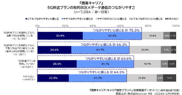 一方「5G料金プランは契約していない」人は、69.6%が「つながりやすいと感じる」と回答した。5G料金プラン契約者と非契約者の「つながりやすいと感じる」割合の差は5.7ポイントだった。