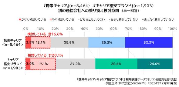 「別の通信会社への乗り換えを検討しているか」については、「かなり検討している」と「やや検討している」の合計の割合が、携帯キャリア利用者で16.6%、キャリア格安ブランド利用者で20.2%となった。