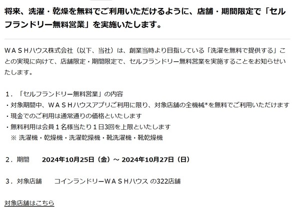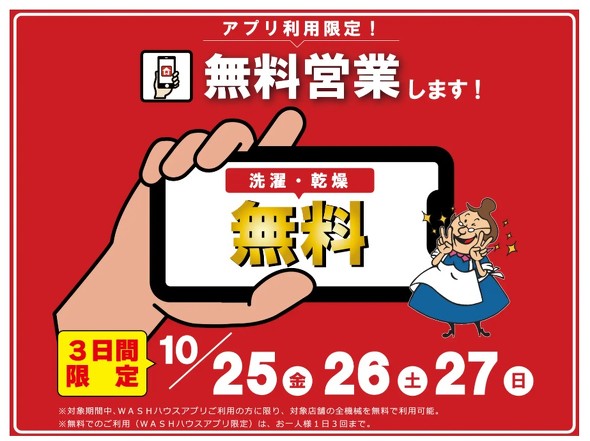 コインランドリーの大手FC企業、WASHハウス(宮崎市)は、タッチパネルの大型モニターをつけたオリジナル洗濯乾燥機を開発しました。狙いはコインランドリーの施設そのものを広告媒体にするという「リテールメディア」の発想です。これにより収益を確保できれば「コインランドリーでの洗濯無料化が実現できる」と同社はいいます。実際にアプリ会員向けとして、10月に3日間限定の「洗濯乾燥無料キャンペーン」を実施しています。