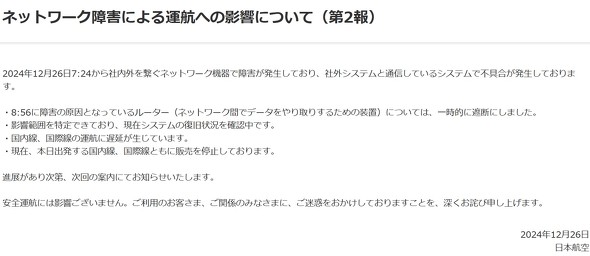 【編集履歴:2024年12月26日午後3時 JALは「障害の原因ならびにシステム不具合による影響範囲を特定し、システムは復旧しました」と発表しました】