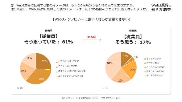 Web3テクノロジーに強い人材しか活躍できないというイメージについて、「とてもそう思う」または「ややそう思う」と回答した人の割合は61%だった。一方、Web3業界への転職後には17%であり、実際に働く中でWeb3テクノロジーに強い人材以外も活躍できると考える人が一定数いると見られる。