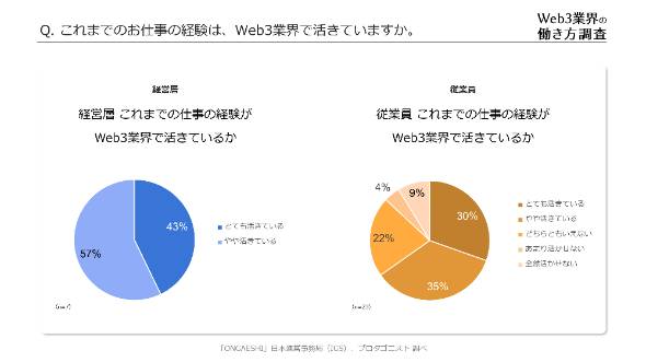 これまでの仕事の経験が、Web3業界で生きるかについては、経営層は100%、従業員の65%が「とてもそう思う」または「ややそう思う」と回答した。
