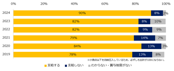2024年の冬季賞与について、90%の企業が「支給する」と回答。過去2年と比べて8ポイント増加し、2021年比で見ると、11ポイントの増加となった。