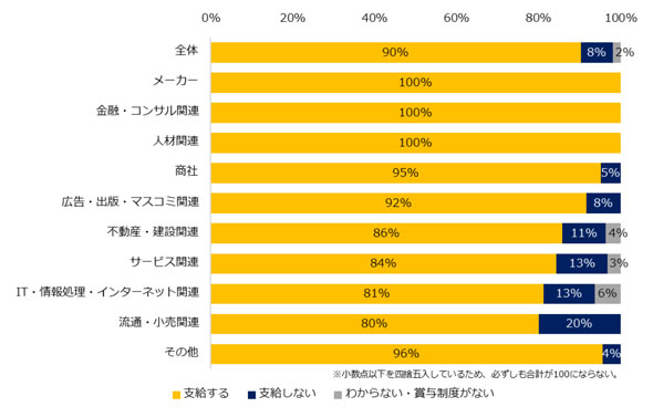 支給割合を業種別で見ると、「メーカー」「金融・コンサル関連」「人材関連」はいずれも100%、「商社」は95%、「広告・出版・マスコミ関連」は92%だった。