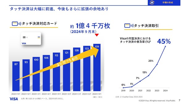 タッチ決済の利用が着実に広がりを見せる中、Visaは新たな成長戦略を打ち出している。現在、国内でのタッチ決済対応カードは約1億4000万枚に達し、Visaの対面決済の45%がタッチ決済で行われるまでに普及した。