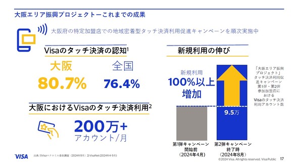 開始から8カ月で、タッチ決済の認知度は全国平均より5%高くなり、月間約200万件の利用があります。2023年と比較した利用増加率も大阪が約120%と、全国平均の約115%を上回っています。スマートフォン決済の普及も全国より速いペースです。