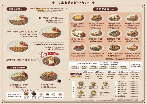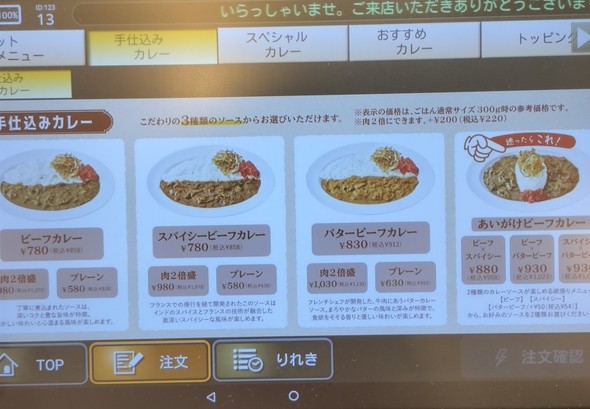 もう一方の新業態店が、12月1日にオープンしたカレー専門店 もう〜とりこである。立地は浅草、雷門からやや離れた六区ブロードウェイ商店街。看板には「しあわせのビーフカレー」と大きく書いてある。浅草にあるとはいえ、インバウンドを意識した店舗づくりにはなっておらず、日本人をターゲットにしていると思われる。店内には注文用のタッチパネルがあるが、英語メニューはなかった。