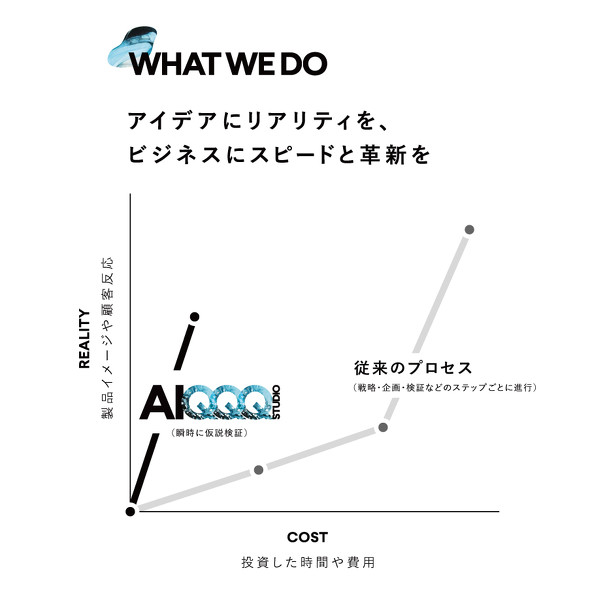 AIQQQ STUDIOは新規事業開発、AICO2はコピー制作といったように、AIソリューションを併用することで、クライアントへの提案の質を上げています。いろいろなプランニング、企画制作運用の全領域にAIを取り入れ、クライアントへの提供価値を高めています。