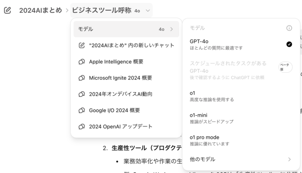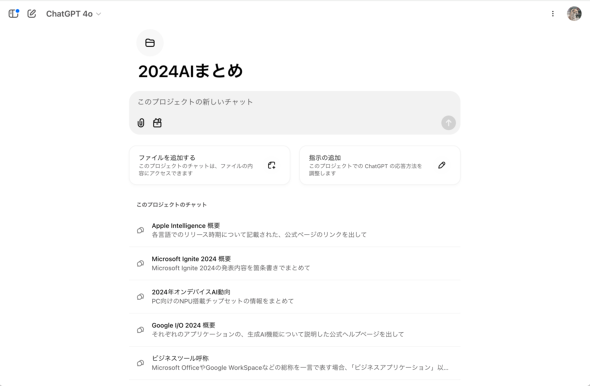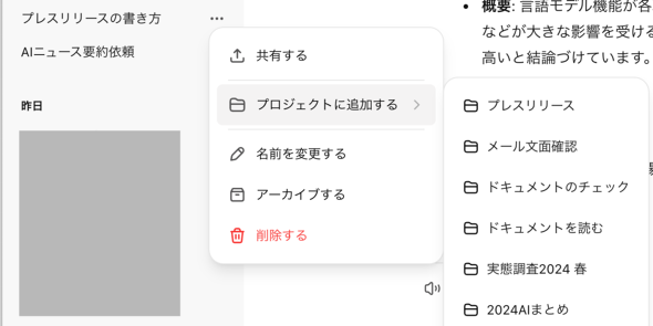 ひとつの業務のために複数のチャットを作成して作業を進めるケースは多いだろう。例えば企画書の作成なら、リサーチやアイデア出しの段階と、仕上げた書類の文章をチェックする段階で別のチャットを使うことになるはずだ。