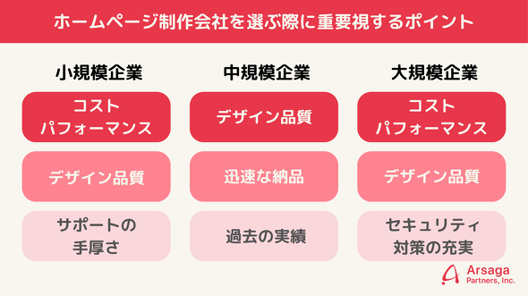 ホームページ制作会社を選ぶ際に重要視するポイントも調査した。小規模企業は「コストパフォーマンス」や「デザイン品質」を重視する傾向が見られた一方、中規模企業は「デザイン品質」を、大企業は「コストパフォーマンス」と「デザイン品質」の両方を重視していた。さらに、大企業では中小企業に比べ、「セキュリティ対策の充実」も重要視していることが分かった。