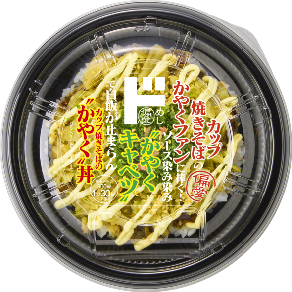カップ焼きそばで味わえる“ソースのしみたキャベツ”を主役に据えた新感覚の丼ぶり。濃厚なソースがしみ込んだキャベツをフリーズドライで再現し、マヨネーズとふりかけをトッピングすることで、あの“カップ焼きそば特有のフニャッとした食感”を忠実に再現した。「容器に張り付いたキャベツを思う存分食べたい」という担当者の偏愛が形になった商品である。ご飯が進む“罪深い”味わいが特徴だ。