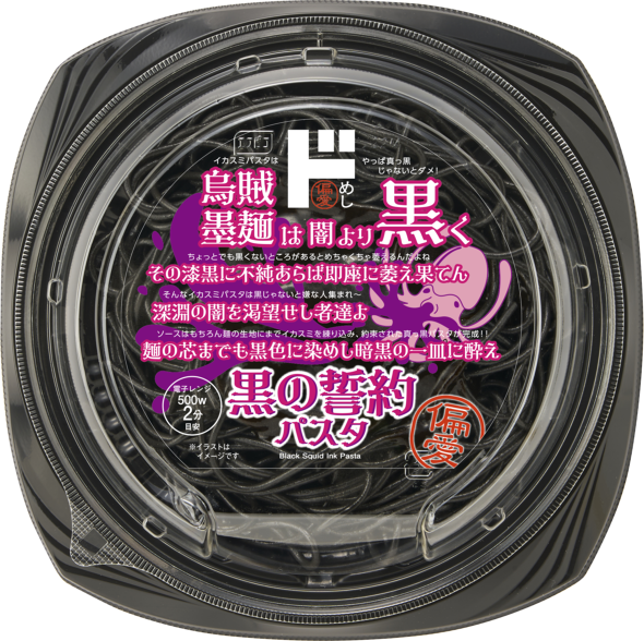 イカ墨を麺にまで練り込み、ソースも含めて真っ黒に仕上げたイカ墨パスタ。“唇が真っ黒になろうが構わない、それが食べた証!”という本物のイカ墨好きにささげる、濃厚かつニンニクが効いた食べ応えのある一品である。外食の場だと気が引けるイカ墨パスタを、家で存分に楽しむための発想が見事に商品化されている。