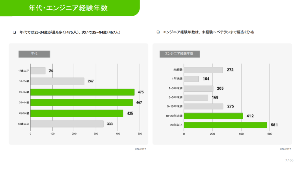 回答者の属性は、25〜34歳が最も多く(475人)、35〜44歳(467人)、45〜54歳(425人)――と続く。エンジニアの経験年数は未経験〜20年以上のベテランまで幅広く分布している。