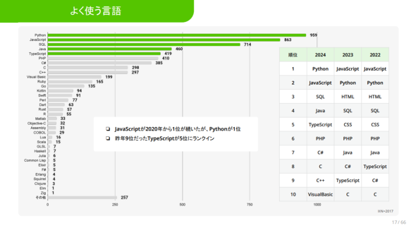 よく使う開発言語は、「Python」(959人)、「JavaScript」(863人)、「SQL」(714人)がトップ3となった。JavaScriptは2020年から1位が続いていたが、今回は2位となった。また、2023年に9位だったTypeScriptが5位にランクインした。