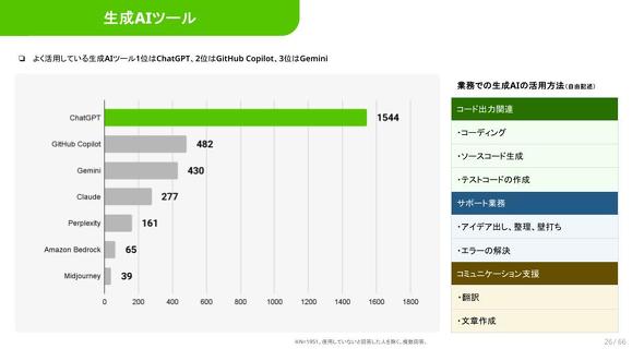 エンジニアがよく活用している生成AIツールでは「ChatGPT」(1544人)が1位にランクイン。2位「GitHub Copilot」(482人)と1062票の差をつけた。生成AIの活用方法としては、コーディングやエラーの解決、翻訳などが挙がった。
