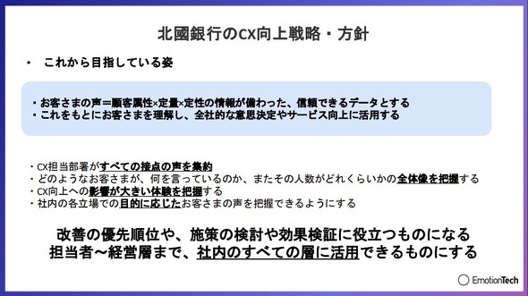 そこで北國銀行は、顧客の声を属性・定量・定性情報を備えた信頼できるデータへと進化させることを目指した。顧客をより深く理解し、全社的な意思決定やCX(Customer Experience)向上に活用できる仕組みづくりを進める。