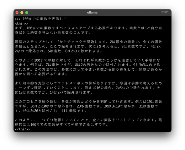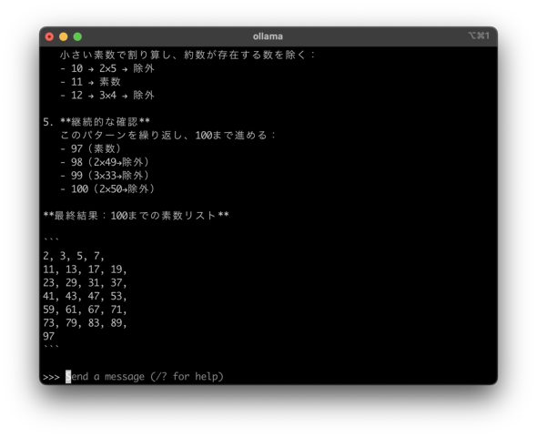 まず、生成AIに思考させるネタとして「100までの素数」を出させてみることにしました。