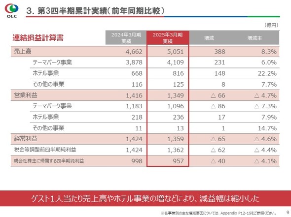 オリエンタルランドの2025年3月期第3四半期決算の累計実績によると、売上高は5051億円(前年同期比8.3%増)と堅調だったものの、営業利益は1349億円(同4.7%減)と減益。純利益も957億円(同4.1%減)とやや伸び悩んだ。
