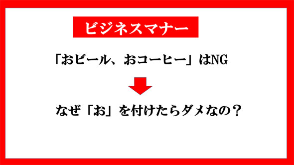 「お」や「ご」は基本的に、カタカナの言葉や外来語、長い単語にはつけません。たまに「おビール」「おコーヒー」などと表現する人がいますが、正しくは、「ビール」「コーヒー」です。「運転免許証」や「参加申込書」など、平仮名表記にしたときに長いなと感じる単語にも「お」や「ご」を加えるのはやめておきましょう。