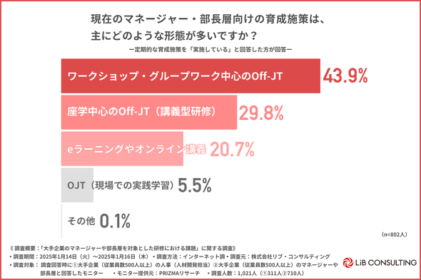 育成施策の形態として最も多かったのは「ワークショップ・グループワーク中心のOff-JT」(43.9%)だった。以降「座学中心のOff-JT(講義型研修)」(29.8%)、「eラーニングやオンライン講義」(20.7%)と続いた。