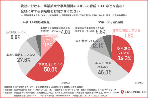 育成施策の中でも、事業拡大や事業開発のスキル育成(OJTなどを含む)に対する満足度については、人事とマネジャー層で認識に差が見られた。