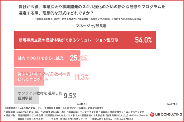 では、マネジャー層はどのような研修を求めているのか? 調査したところ、54.0%が「新規事業立案の模擬体験ができるシミュレーション型研修」と回答した。実践的な学びを求めるニーズが強いことが分かる。以降「社内でのOJTをさらに拡充」(25.2%)、「従来の講義スタイルをベースにしたプログラム」(11.3%)と続いた。