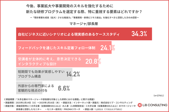 「今後、事業拡大や事業開発のスキルを強化するために新たな研修プログラムを選定する際、特に重視する要素はどれですか?」という質問に対しては、34.3%が「自社ビジネスに近いシナリオによる現実感のあるケーススタディ」と答えた。2位は「フィードバックを通じたスキル定着フォロー体制」(24.1%)、3位は「受講者が主体的に考え、意思決定できるインタラクティブな設計」(20.8%)となった。