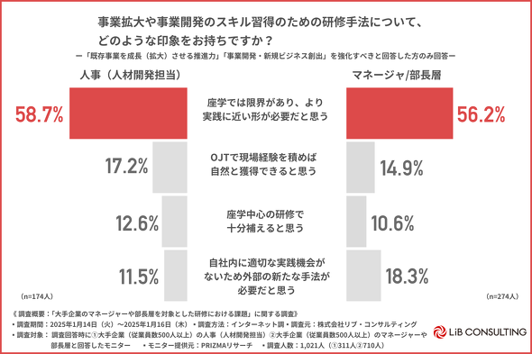 事業拡大や事業開発のスキル習得のための研修手法については、人事とマネジャー層のそれぞれ半数以上が「座学では限界があり、より実践に近い形が必要だと思う」と回答した。