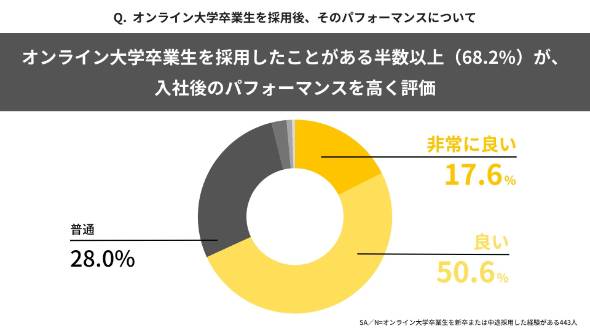 次に、オンライン大学の卒業生を新卒または中途採用した担当者443人に対し、採用後のパフォーマンスについて尋ねた。「非常に良い」(17.6%)、「良い」(50.6%)と回答した人の割合は68.2%に達していて、オンライン大学卒業生の入社後のパフォーマンスは高く評価されている。