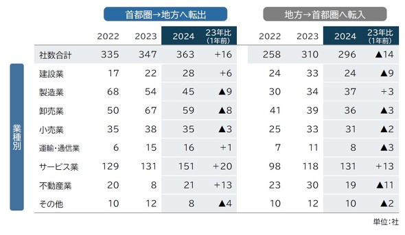 2024年に首都圏から地方へ本社を移転した企業は363社だった。2023年(347社)に比べて16社・4.6%の増加となったほか、1990年以降で最多を更新した。地方から首都圏への移転は296社で、首都圏では67社の転出超過となった。大阪府や静岡県などに多くの企業が移転し、業種別ではサービス業が顕著だった。