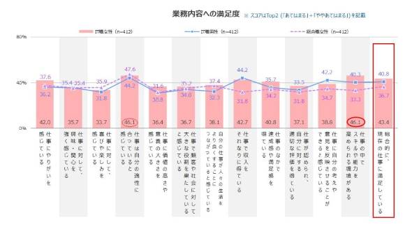 特に、IT職の女性は「仕事は自分の適性に合っている」や「仕事の中でスキルや能力を高められる環境がある」(同46.1%)といった点に満足度が高かった。