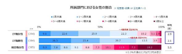 IT職の所属部門における女性の割合については、4割未満が8割を超えている。平均を見ても、総合職と比較してIT職の方が、女性の割合が低い結果となった。
