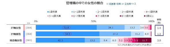 管理職における女性の割合についても、総合職は平均3割に対し、IT職は1割強にとどまっている。IT職の人が所属する部門における女性管理職の割合も低く「1割未満」と回答した人が半数を超えた。