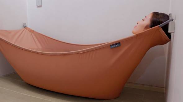 壁・天井・床が一体化しているユニットバスで、空間自体のサイズは従来と同様だが、浴槽を長辺に配置することで従来の浴槽よりも足を伸ばしやすいという。布ならではの頭や体がフィットするような入浴の感覚や、5色のカラーバリエーションから選べる点も同商品ならでは。