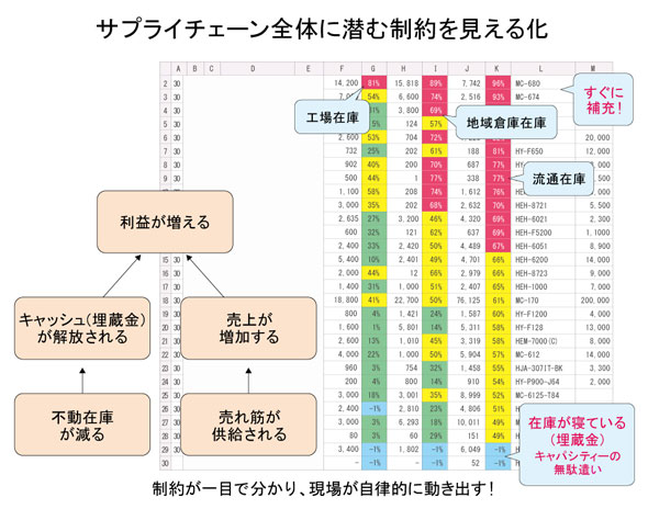 つまり、ここに制約がある。赤色で示された製品を集中して生産すれば、制約は解消され、販売機会を逃さずにすむ。一方、水色で示された過剰在庫の製品については、「売れないモノをつくりたい」と思う人はいないから、生産は自然に抑制される。