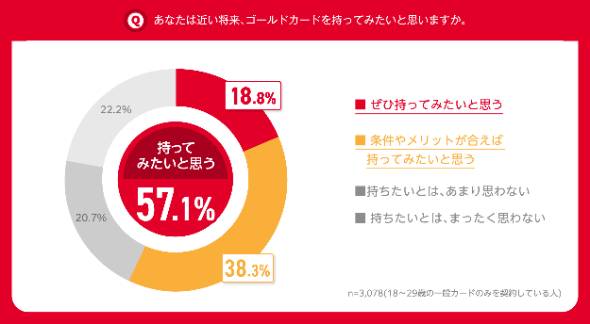 ゴールドカード未保有者に、ゴールドカードを持ってみたいか尋ねると、「条件やメリットが合えば持ってみたいと思う」(38.3%)、「ぜひ持ってみたいと思う」(18.8%)と、合わせて57.1%の人が持ちたいと考えていた。
