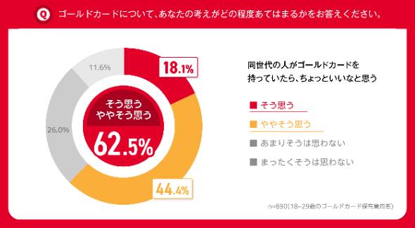 「同世代の人がゴールドカードを持っていたら、ちょっといいなと思うか」については、「そう思う」(18.1%)、「ややそう思う」(44.4%)と、合計で62.5%を占めた。ゴールドカードを持つことに価値を感じる傾向が、一定数見られた。