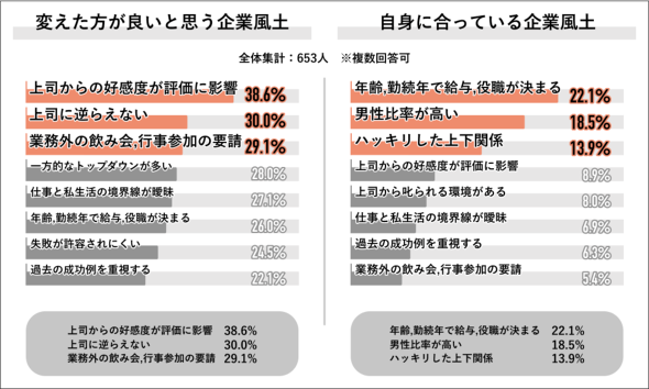 変えた方がいいと思う企業風土を尋ねたところ、最も多かった意見は同様に「上司からの好感度が評価に影響すること」(38.6%)だった。以降「上司に逆らえない」(30.0%)、「業務外の飲み会、行事参加の要請」(29.1%)、「一方的なトップダウンが多い」(28.0%)と続いた。