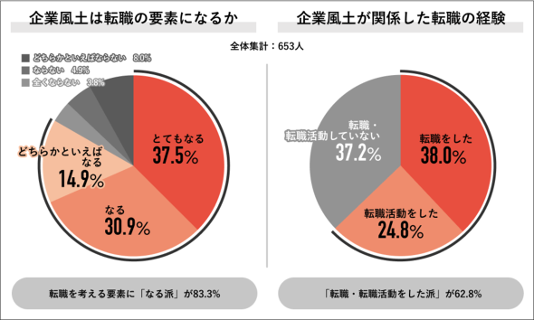 企業風土は転職を考える要素になるか。83.3%が「なる」(「とてもなる」「なる」「どちらかといえばなる」の合算)と回答しており、反対意見は少数だった。実際に転職や転職活動など行動に移した人は62.8%に上っている。